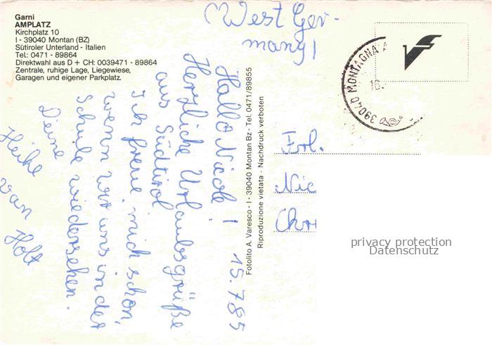 74100331 old postcard Montan Bozen Suedtirol IT Garni Hotel Amplatz Restaurant Foyer postalisch gelaufen Erhaltung siehe scans [FriedD77] KatCode: 11240