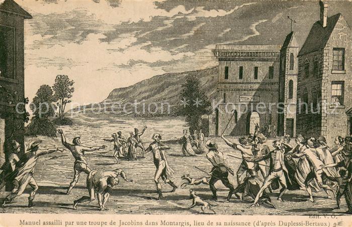 13697463 Montargis 45 Manuel assailli par une troupe de Jacobins dans Montargis lieu de sa naissance postalisch nicht gelaufen Erhaltung siehe scans [WerneD78] Wern Katcode 11170045145208