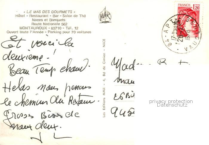 13575747 carte postale Montauroux Hotel Restaurant Le mas des Gourmets postalisch gelaufen Erhaltung siehe scans [LiesaD40] KatCode: 11170083183081
