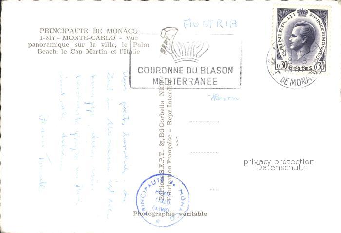 old postcard Monte-Carlo Vue panoramique Palm Beach Cap Martin Frontiere Italie Principaute Cote d Azur postalisch gelaufen Erhaltung siehe scans