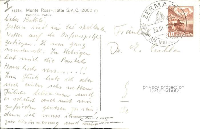12346143 alte Postkarte Monte Rosa Huette mit Castor und Pollux postalisch gelaufen Erhaltung siehe scans KatCode: 11470500440930
