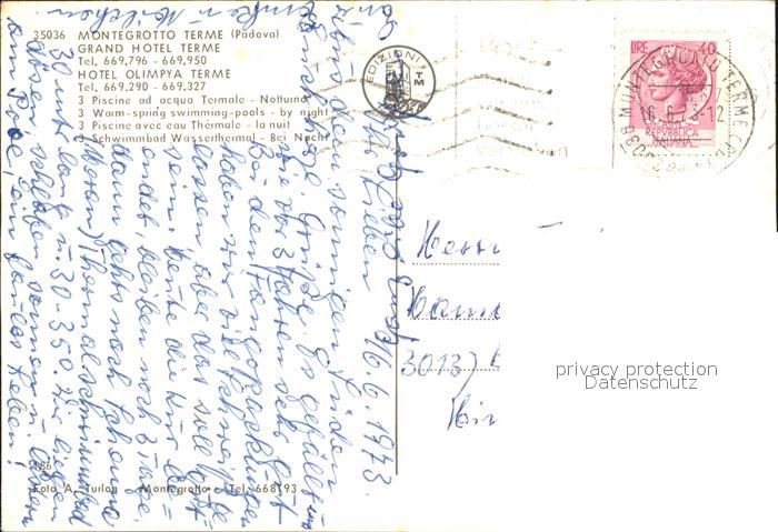old postcard Montegrotto Terme Grand Hotel Terme Nachtaufnahme postalisch gelaufen Erhaltung siehe scans