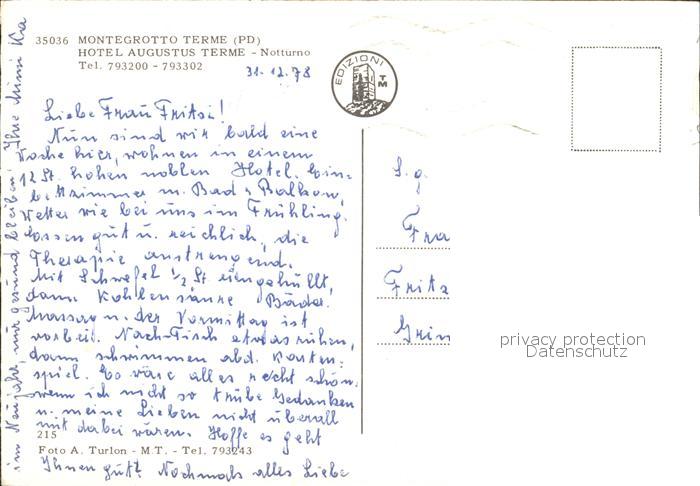old postcard Montegrotto Terme Hotel Augustus Terme postalisch gelaufen Erhaltung siehe scans