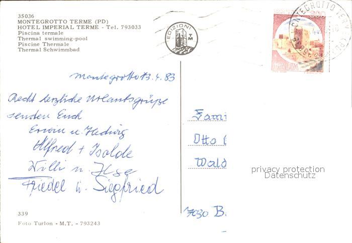 old postcard Montegrotto Terme Hotel Imperial Therme postalisch gelaufen Erhaltung siehe scans