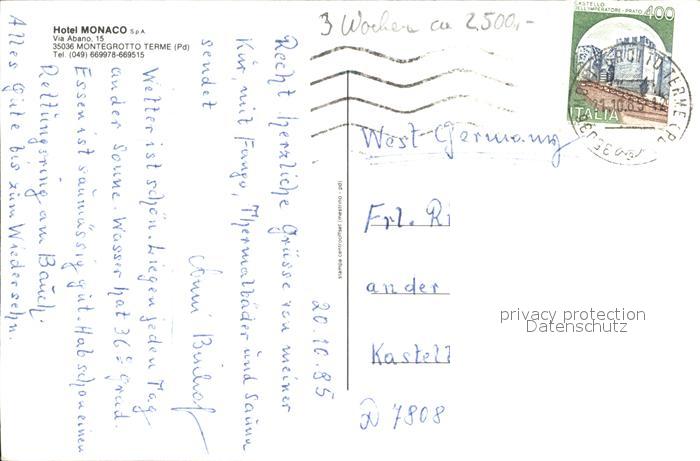 old postcard Montegrotto Terme Hotel Monaco postalisch gelaufen Erhaltung siehe scans