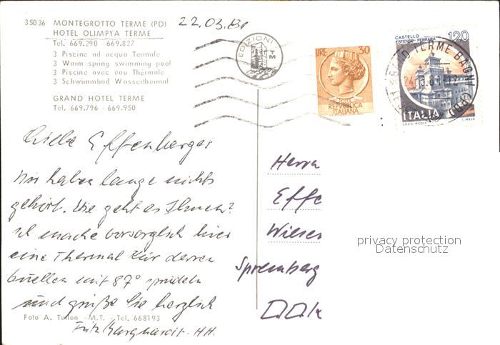 old postcard Montegrotto Terme Hotel Olympia Terme postalisch gelaufen Erhaltung siehe scans