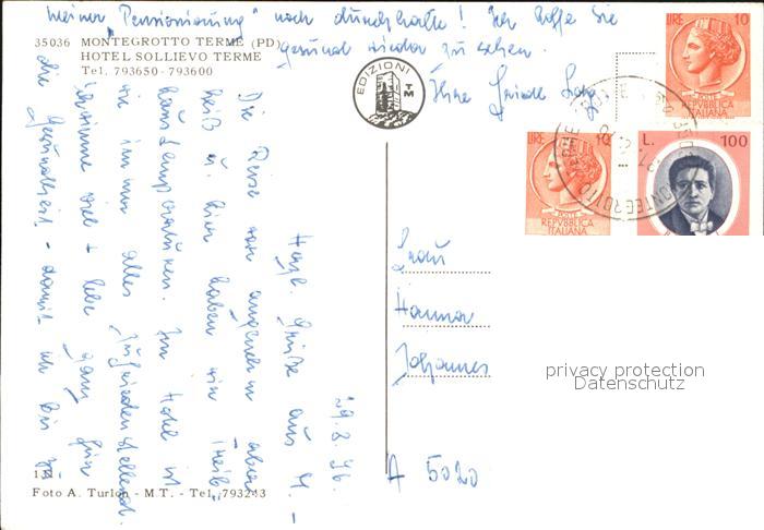 old postcard Montegrotto Terme Hotel Sollievo Terme postalisch gelaufen Erhaltung siehe scans