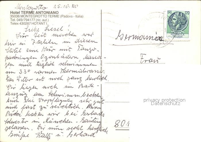 old postcard Montegrotto Terme Hotel Terme Antoniano postalisch gelaufen Erhaltung siehe scans