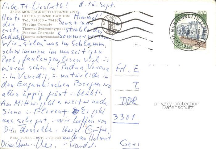 old postcard Montegrotto Terme Hotel Terme Garden Piscina Thermalschwimmbad postalisch gelaufen Erhaltung siehe scans