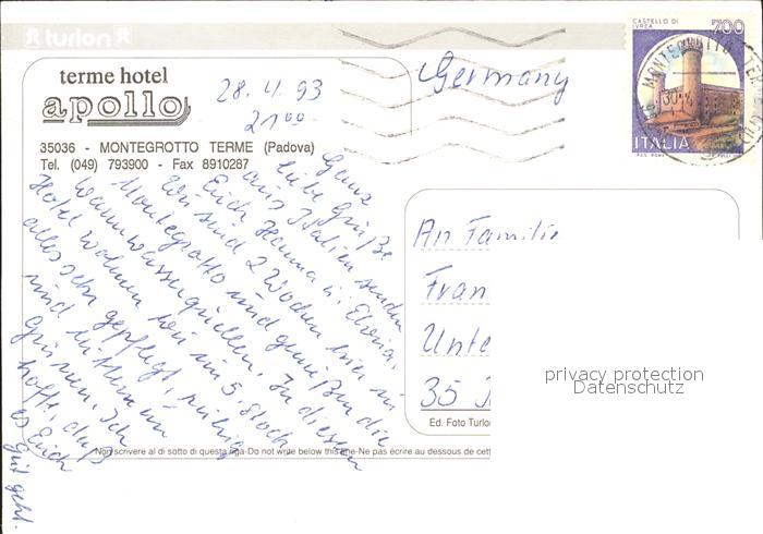 old postcard Montegrotto Terme Terme Hotel Apollo postalisch gelaufen Erhaltung siehe scans