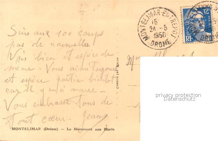 13535534 carte postale Montelimar Monument aux Morts Kriegerdenkmal postalisch gelaufen Erhaltung siehe scans [FriedD77] KatCode: 11170026226198