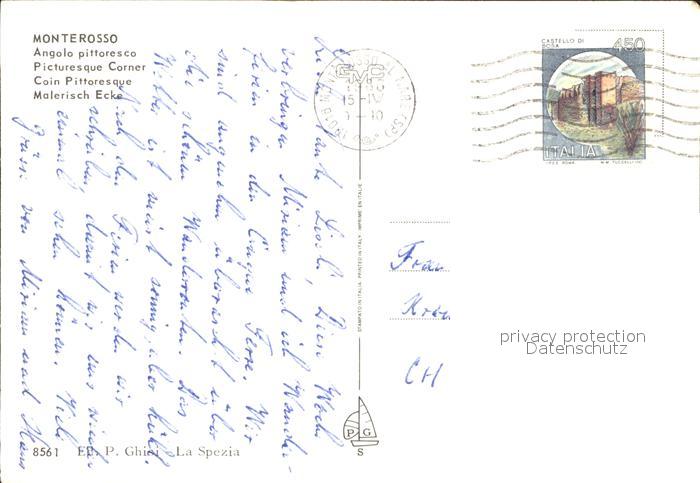 old postcard Monterosso al Mare Angolo pittoresco Malerische Ecke Hafen Kueste postalisch gelaufen Erhaltung siehe scans