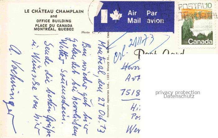 74018320 old postcard MONTREAL QUEBEC Canada Le Château Champlain and Office Building postalisch gelaufen Erhaltung siehe scans [FriedD77] KatCode: 14110