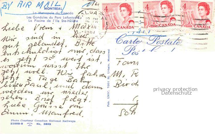 74117851 old postcard MONTREAL QUEBEC Canada Les Gondoles du Parc Lafontaine La Piscine de l’Ile Ste Helene postalisch gelaufen Erhaltung siehe scans [WerneD78] KatCode: 14110