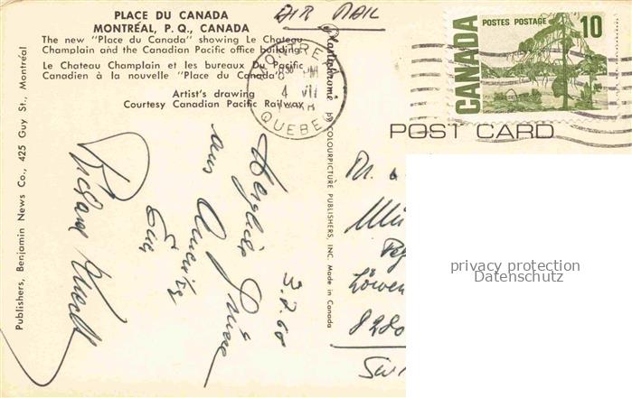 74132622 old postcard MONTREAL QUEBEC Canada Place du Canada Château Champlain Canadian Pacific Office Building Illustration postalisch gelaufen Erhaltung siehe scans [FriedD77] KatCode: 14110