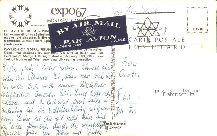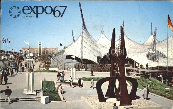 old postcard Montreal Quebec EXPO 67 Pavilion of Germany postalisch gelaufen Erhaltung siehe scans