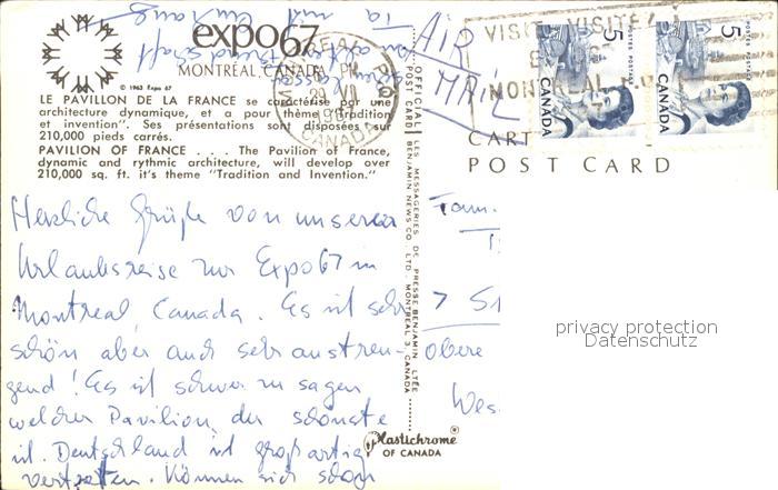 old postcard Montreal Quebec Expo 67 Pavillon de la France postalisch gelaufen Erhaltung siehe scans