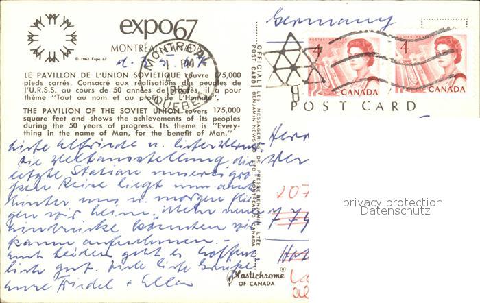 old postcard Montreal Quebec EXPO 67 Pavillon de Union Sovietique postalisch gelaufen Erhaltung siehe scans