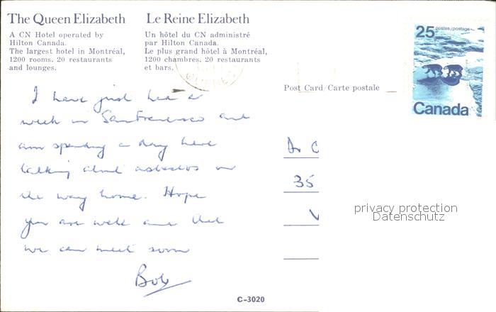 old postcard Montreal Quebec The Queen Elizabeth Hotel Hilton postalisch gelaufen Erhaltung siehe scans
