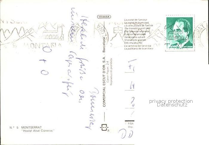 old postcard Montserrat Kloster Hostal Abat Cismeros postalisch gelaufen Erhaltung siehe scans