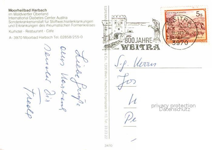 72666459 alte Postkarte Moorbad Harbach Moorheilbad Diabetes Center Austria Schafe Nebelsteinhuette Kirche Waldpension Mandelstein Felsen postalisch gelaufen Erhaltung siehe scans [FriedD77] KatCode: 11390124030913