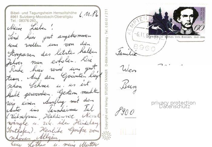 72828779 alte Postkarte Moosbach Sulzberg Bibel- Tagungsheim Hensoltshoehe Widderstein Gruenten postalisch gelaufen Erhaltung siehe scans [NatalD47] KatCode: 11110009780140