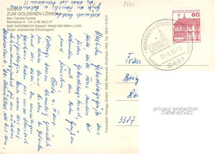 73651649 alte Postkarte Moosbach Vohenstrauss Gasthof zum Goldenen Loewen Restaurant Panorama postalisch gelaufen Erhaltung siehe scans [FriedD77] KatCode: 11110009374137