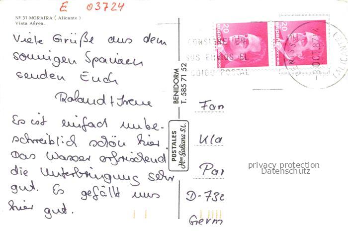 74006223 old postcard Moraira Alicante ES Vista aérea postalisch gelaufen Fliegeraufnahme Erhaltung siehe scans [FriedD77] KatCode: 11510