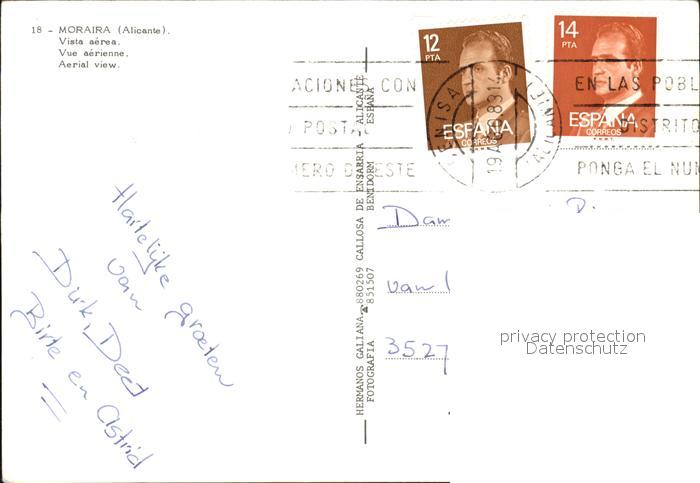 alte Postkarte Moraira Vista aerea postalisch gelaufen Erhaltung siehe scans