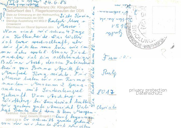 72919676 alte Postkarte Morgenroethe-Rautenkranz Geburtsort des 1. Fliegerkosmonauten der DDR Ausstellung MIG 21 Elternhaus Oberst Sigmund Jahn postalisch gelaufen Erhaltung siehe scans [FriedD77] KatCode: 11110014178360