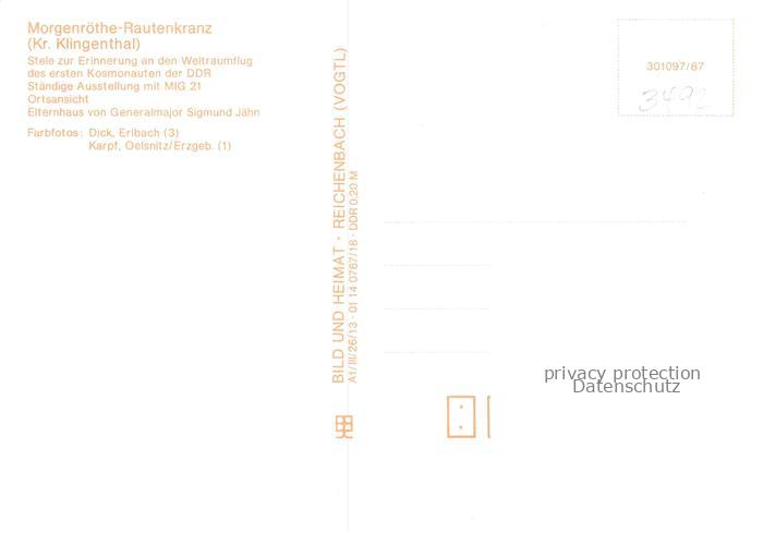 74084702 Morgenroethe-Rautenkranz Stele des ersten Kosmonauten MIG 21 Ortspartie Elternhaus von Generalmayor Sigmund Jaehn postalisch nicht gelaufen Erhaltung siehe scans [WerneD78] KatCode: 11110014178360