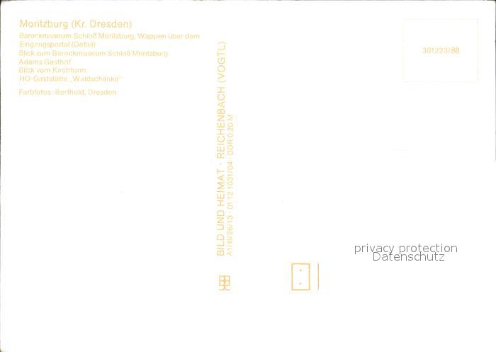 72263035 Moritzburg Sachsen Barockmuseum Schloss Wappen Adams Gutshof Blick vom Kirchturm HO Gaststaette Waldschaenke postalisch nicht gelaufen Erhaltung siehe scans KatCode: 11110014280260