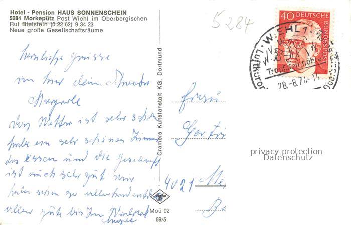 74097154 alte Postkarte Morkepuetz Wiehl Oberbergischer-Kreis NRW Hotel Pension Haus Sonnenschein postalisch gelaufen Erhaltung siehe scans [FriedD77] KatCode: 11110005374048
