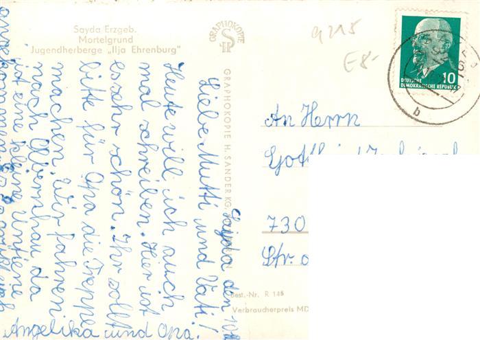 73908296 Mortelgrund Sayda Jugendherberge Ilja Ehrenburg postalisch gelaufen Erhaltung siehe scans [FriedD77] alte Postkarte Frie Katcode 11110014177380