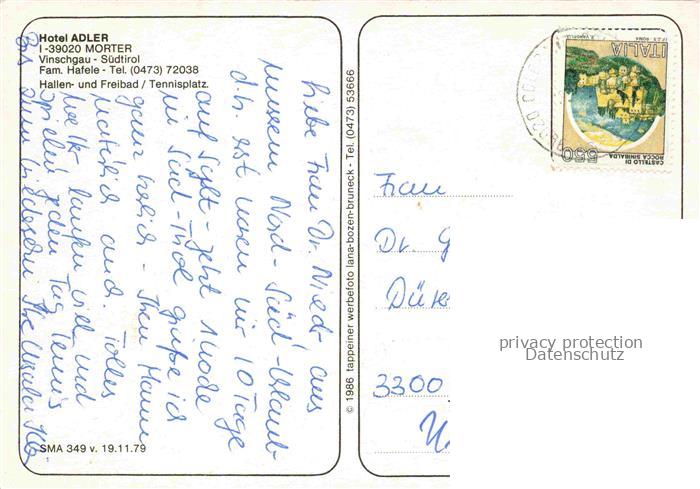 74044064 old postcard Morter Vinschgau IT Hotel Adler Fliegeraufnahme postalisch gelaufen Erhaltung siehe scans [WerneD78] KatCode: 11240