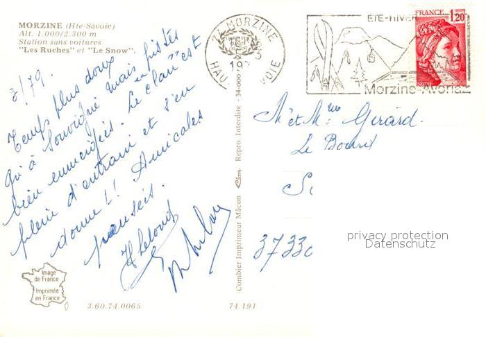 13478037 carte postale Morzine Hotels Les Ruches et Le Snow Wintersportplatz Franzoesische Alpen postalisch gelaufen Erhaltung siehe scans [FriedD77] KatCode: 11170074474191