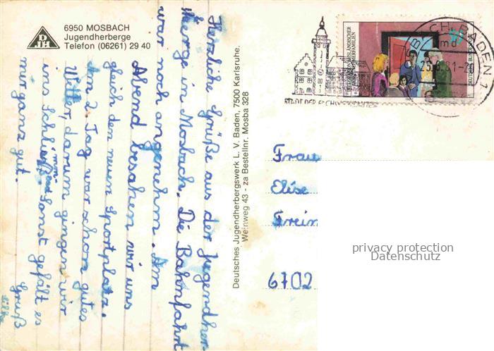 74048154 alte Postkarte Mosbach Baden Neckar-Odenwald-Kreis BW Jugendherberge Tagesraum Palmsches Haus Freibad Rathaus Brunnen postalisch gelaufen Erhaltung siehe scans [FriedD77] KatCode: 11110008225058