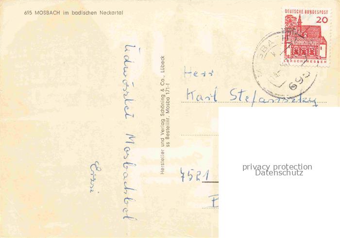 74047895 alte Postkarte Mosbach Baden Neckar-Odenwald-Kreis BW Kirche Rathaus Palmsches Haus Panorama Schwanenteich postalisch gelaufen Erhaltung siehe scans [WerneD78] KatCode: 11110008225058