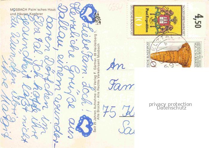 74048306 alte Postkarte Mosbach Baden Neckar-Odenwald-Kreis BW Palmsches Haus Stadt der Fachwerkhaeuser postalisch gelaufen Erhaltung siehe scans [FriedD77] KatCode: 11110008225058