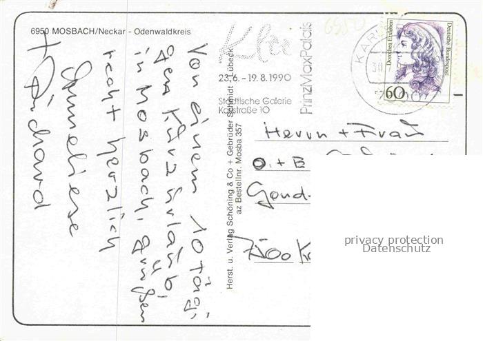 74048303 alte Postkarte Mosbach Baden Neckar-Odenwald-Kreis BW Stadt der Fachwerkhaeuser Palmsches Haus Rathaus Fussgaengerzone postalisch gelaufen Erhaltung siehe scans [FriedD77] KatCode: 11110008225058