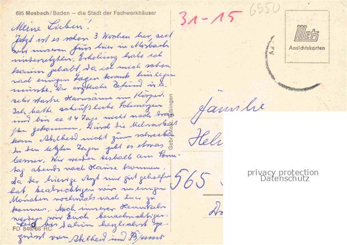 74047914 alte Postkarte Mosbach Baden Neckar-Odenwald-Kreis BW Stadtkirche Hauptstrasse Palmsches Haus Schloesschen Marktplatz Rathaus Haus Kickelhain postalisch gelaufen Erhaltung siehe scans [WerneD78] KatCode: 11110008225058