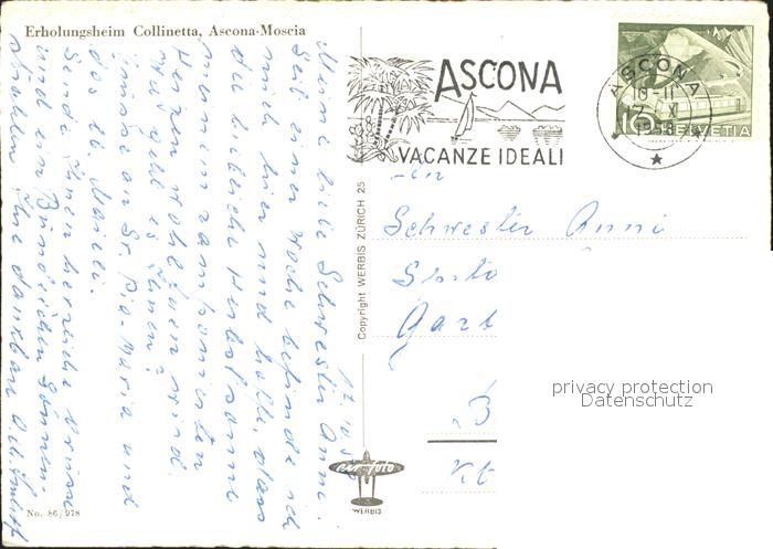 11643813 alte Postkarte Moscia Ascona Erholungsheim Collinetta postalisch gelaufen Erhaltung siehe scans KatCode: 11470210655908