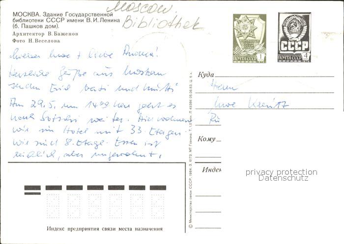 old postcard Moscow Moskva Bibliothek postalisch gelaufen Erhaltung siehe scans