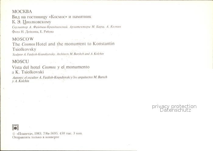 Moscow Moskva Cosmos Hotel Monument to Konstantin Denkmal postalisch nicht gelaufen Erhaltung siehe scans