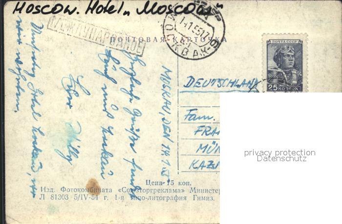 old postcard Moscow Moskva Hotel Moscow postalisch gelaufen Erhaltung siehe scans