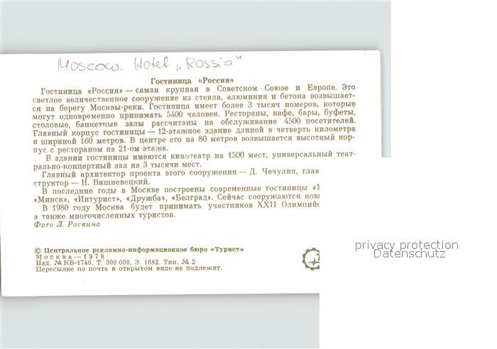 Moscow Moskva Hotel Rossia Fahrgastschiff postalisch nicht gelaufen Erhaltung siehe scans