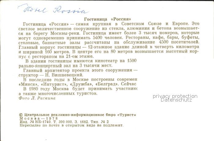 Moscow Moskva Hotel Rossija postalisch nicht gelaufen Keine Postkarte (siehe scan) Erhaltung siehe scans [NatalD47 kv013box]