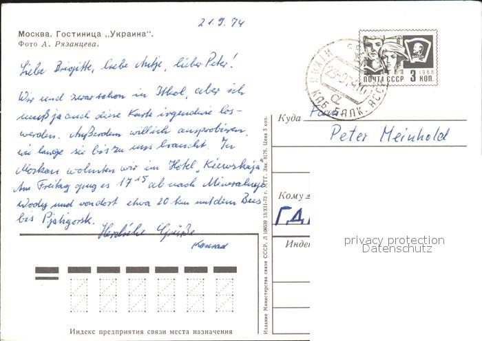 old postcard Moscow Moskva Hotel Ukraine postalisch gelaufen Ganzsache (eingedruckte Briefmarke) Erhaltung siehe scans