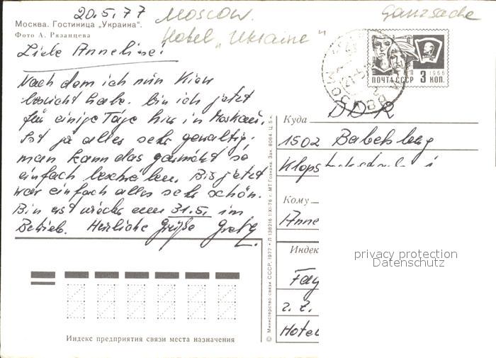 old postcard Moscow Moskva Hotel Ukraine postalisch gelaufen Ganzsache (eingedruckte Briefmarke) Erhaltung siehe scans