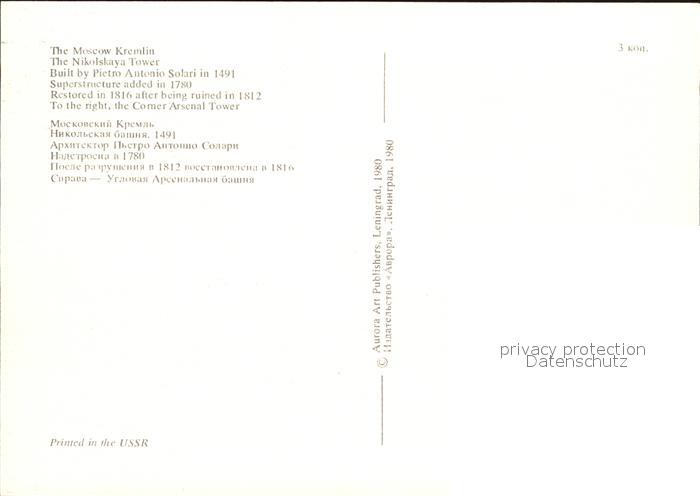 Moscow Moskva Kremlin Nikolskaya Tower postalisch nicht gelaufen Erhaltung siehe scans [NatalD47]